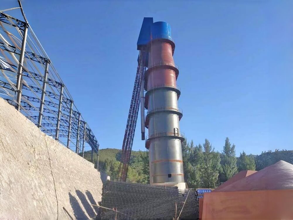 项目简介:始建于2019年12月31日,炉体外径为7200mm,内径为800mm,窑壳体高为34.5m,4座(单座日300吨)自动化混烧式环保竖窑。